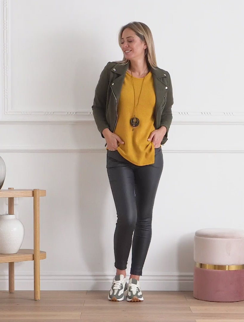 Pull fin asymétrique à manches longues retroussables - Jaune moutarde